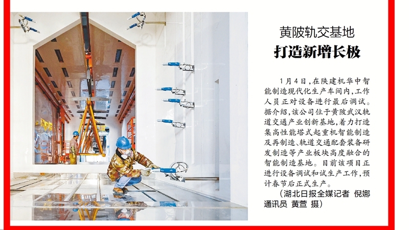 黄陂轨交基地 打造新增长极1月4日,在陕建机华中智能制造现代化生产车间内,工作人员正对设备进行最后调试。据介绍,该公司位于黄陂武汉轨道交通产业创新基地,着力打造集高性能塔式起重机智能制造及再制造、轨道交通配套装备研发制造等产业板块高度融合的智能制造基地。目前该项目正进行设备调试和试生产工作,预计春节后正式生产。(湖北日报全媒记者 倪娜 通讯员 黄萱 摄)